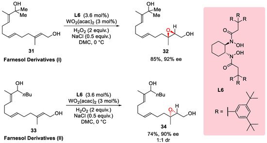 The regioselective synthesis of compounds featuring multiple olefin and alcohol moieties stands as a formidable challenge in organic chemistry. In a seminal study by Wang et al. in 2014, the potential of two farnesol derivatives, 31 and 33, as precursors for such intricate compounds was systematically explored using a meticulously designed catalyst system. Through the application of this catalyst system, the desired products were obtained with striking regioselectivity. The synthetic approach involved the strategic functionalization of specific positions on the farnesol derivatives, resulting in the creation of compounds adorned with multiple olefin and alcohol moieties. The notable regioselectivity achieved in this transformation underscores the efficiency and precision of the catalyst system, unveiling novel avenues for the synthesis of complex molecules characterized by diverse functionalities (Scheme 9) [24].