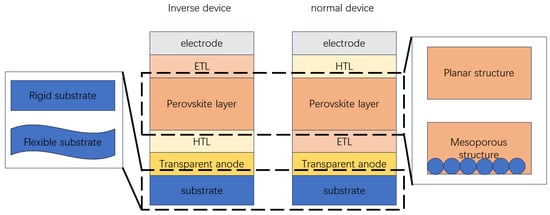 In contrast to the normal planar structure, the inverted planar structure first deposits HTL on the substrate. p-i-n-structured devices are constructed of transparent electrode/HTL/perovskite layer/ETL/metal electrode. The perovskite film absorbs sunlight after passing through transparent electrodes and HTL and is finally converted into free carriers. The electrons and holes are transferred from the metal electrode and the transparent electrode to the external circuit, respectively.