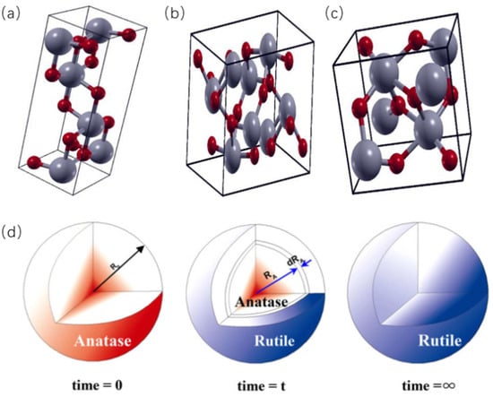 There are three phases of TiO2: anatase, rutile, and brookie [18], of which the structures are shown in Figure 2a–c. The band gap of rutile is 3.06 eV, while anatase TiO2 is generally believed to have an absorption edge of about 3.2 eV. The band gap energy of brookite is between 3.1 and 3.4 eV [19]. The preparation of brookite is complex, so there are few studies about this phase. The anatase and rutile are the most valuable polymorphs of TiO2; anatase is stable in low temperatures, and rutile is a steady phase at high temperatures [19]. The phase transition of TiO2 is related to annealing time, heating rate, and temperature, and these factors can also affect the morphology of TiO2. Because of the lower Gibbs free energy of the rutile phase, the rutile phase will transform into the anatase phase at reduced temperatures [20], and the phase transition from the rutile phase to the anatase phase is non-spontaneous. Some studies have shown that the anatase phase begins to transform from amorphous to crystalline below 280 °C [21], and the anatase phase transforms into a rutile crystalline phase above 700 °C [22]. Figure 2d shows the transformation mechanism from the anatase phase to the rutile phase. The phase transition mechanism is a core–shell reaction process. During the heating process, the phase transformation begins at the surface. With the extension of reaction time, the phase transition from anatase to rutile occurs from surface to interior [23].