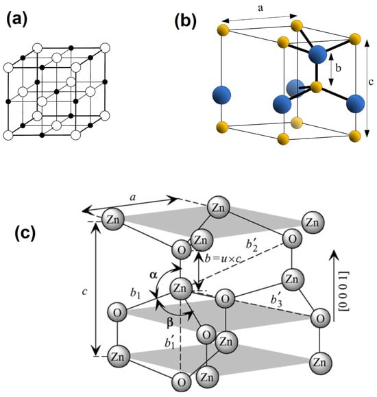 Structures of ZnO. In (a), cubic rock salt; in (b), wurtzite hexagonal; and in (c), the wurtzite lattice constants a–c [34]. Copyright 2022, MDPI publishing.