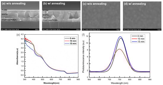 Cross-sectional view and top-view SEM images of ITO/PTAA/PMMA/MAPbI3/PCBM (a), (c) without annealing, and (b,d) with annealing [61]. Copyright 2022, Springer publishing. (e) Ultraviolet-visible absorption spectra and (f) PL spectra of ITO/PEDOT:PSS/MAPbI3-xClx/PCBM with different annealing times of the PCBM [62]. Copyright 2022, Springer publishing.