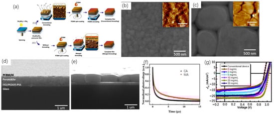 In addition to the conventional annealing method (CA), where annealing of PCBM and perovskite are separated, the perovskite layer and PCBM can be simultaneously annealed, called the combined annealing method (MA), as shown in Figure 10a. Liu et al. prepared a batch of devices using the MA method [63]. The SEM and AFM of these devices are shown in Figure 10b–e. Compared with CA perovskite films, the crystallinity and grain size of MA films are significantly improved. Notably, monocrystalline perovskite particles were observed in cross-sectional SEM images of MA films. As shown in Figure 10d,e, unlike the small grains of CA film, which are unclear and different in size, MA film presents uniform monocrystalline perovskite grains, most of which are close to the top layer of PCBM/Al from the bottom electrode. This can effectively extract the charge at the electrode via direct transport channels in the perovskite crystals and significantly reduce the grain boundaries longitudinally. Wu et al. used transient photovoltage (TPV) measurements to study the charge recombination dynamics inside devices [64]. As shown in Figure 10f, MA-based devices have a longer attenuation lifetime compared to CA-based devices, indicating slower recombination kinetics and less energy loss due to the passivation of interface defects [65]. This indicates that the MA process and its merging interface can inhibit charge recombination and reduce energy loss, which is conducive to the increase in Voc. Zhou et al. dissolved PCBM in the anti-solvent CB to control the content of PCBM and dropped the solution on the surface of perovskite during the spin coating process. The J–V curve is shown in Figure 10g [66].