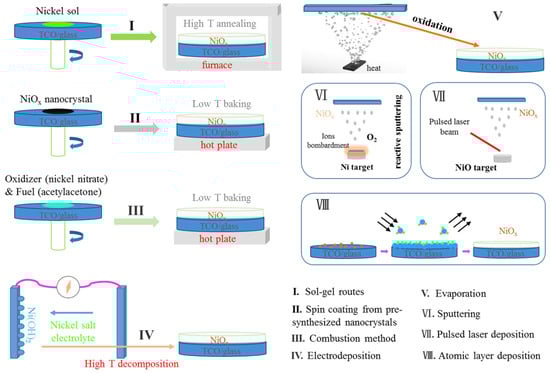 There are many methods to deposit NiO films in PSCs, including evaporation, sputtering, pulsed laser deposition (PLD), atomic layer deposition (ALD), the sol–gel method, spin-coating of pre-synthesized nanocrystals, and electrodeposition. Figure 11 illustrates several different synthesis methods [75].