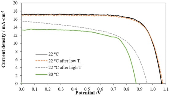 I–V curves of PSCs employing LiTFSI- and tBP-doped spiro-OMeTAD operating at various temperatures [83]. Copyright 2019, Wiley Publishing.