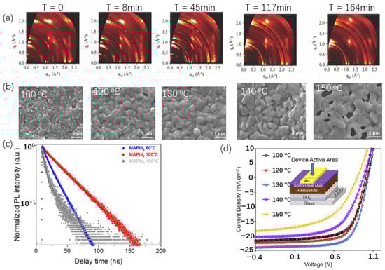 (a) Two-dimensional GIWAXS patterns recorded during annealing at 80 °C; images were captured at T = 0, T = 8 min, T = 8 min, T = 45 min, T = 117 min, and T = 164 min [92]. Copyright 2016, Wiley Online Library publishing. (b) SEM images of perovskite films annealed at 100 °C, 120 °C, 130 °C, 140 °C, and 150 °C [93]. Copyright 2021, AMER INST PHYSICS publishing. (c) Evolution of P.L. decay measured using time-correlated single photon counting (TCSPC) technique using 475 nm excitation (2 MHz, 100 nJ cm−2 fluence), 775 nm emission (slit opening 10 nm) with a 645 nm long-pass filter for MAPbI3 prepared at 60 °C, 100 °C, and 150 °C [94]. Copyright 2021, Frontiers Media S.A. publishing. (d) Current density–voltage curves of perovskite solar cells that were annealed at different temperatures (the inset is the schematic of the device structure, indicating the device active area) [93]. Copyright 2021, AMER INST PHYSICS publishing.