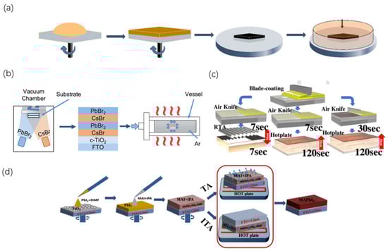 High-performance perovskite devices need to prepare perovskite films with high crystallinity and good surface morphology [95]. Most current methods for preparing PSCs involve depositing a perovskite precursor solution, adding antisolvent (AS) such as chlorobenzene to induce nucleation, and finally, thermal annealing to vaporize the solvent and promote the crystallization of the perovskite in the desired form [96]. However, this traditional annealing method cannot recover organic solvents, causes much waste, and cannot be applied in large-area preparation. The perovskite layer needs to be annealed at more than 100 °C for 30 min, resulting in a significant increase in manufacturing costs. Hence, people began to work on other low-temperature, rapid annealing methods, such as the solvent vapor annealing method [97], flash infrared annealing method (FIRA) [98], and intense pulsed light annealing [99].