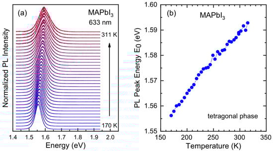 (a) P.L. spectra of MAPbI3 measured at different temperatures in the range of stability of the tetragonal phase (ca. 170 to 311 K) using the red line (633 nm) for excitation. The spectra were normalized to their maximum intensity and plotted with a vertical shift for increasing temperature. Change in color indicates an increase in temperature. (b) A plot of the temperature dependence of the maximum peak position E0 of the spectra displayed in part (a) [121]. Copyright 2019, AMER CHEMICAL SOC publishing.