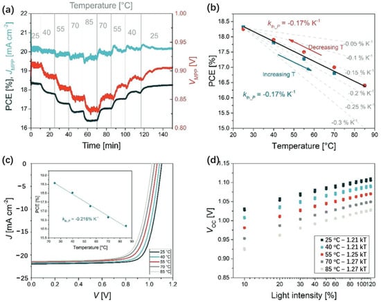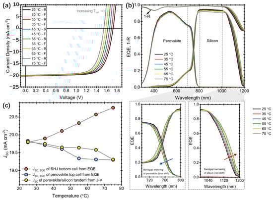 Aydin et al. demonstrated temperature-dependent J–V measurements in a laboratory environment [122] by varying the temperature between 25 and 75 °C in a simulated AM1.5G spectrum over the expected operating temperature range (Figure 17a). In the study, we can find that with the increased temperature, the JSC of the device decreases. This current mismatch is because the Eg of c-Si and perovskite layers varies with temperature: c-Si Eg narrows with increasing temperature, while perovskite Eg broadens.