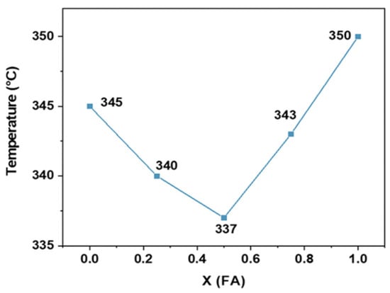 Temperature also will make the perovskite degrade. MA+ and I− ions with lower activation energy may migrate in high temperatures [123]. Smaller perovskite crystals are more likely to decompose than bulk perovskite crystals due to higher defect distribution density and more ion migration channels provided by the surface and grain boundaries, thus further reducing the activation energy [124]. Chen et al. used TGA-FTIR to study the thermal decomposition process of mixed cationic perovskite FAxMA1-xPbI3 under different F.A. and M.A. cation ratios. The experimental results show that the thermal decomposition of M.A. and F.A. cations occurs in all stages of the decomposition process of mixed cation perovskite. Chen et al. used TGA-FTIR to study the thermal decomposition process of mixed cationic perovskite FAxMA1-xPbI3 under different FA+ and MA+ cation ratios. The experimental results show that the thermal decomposition of M.A. and F.A. cations occurs in all stages of the decomposition process of mixed cation perovskite. Figure 18 shows the temperature at which the perovskite begins to decompose at different proportions.