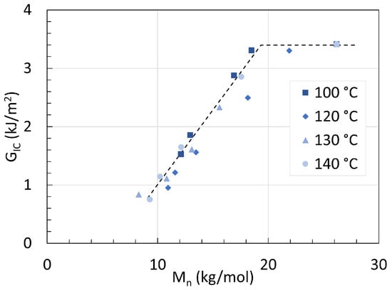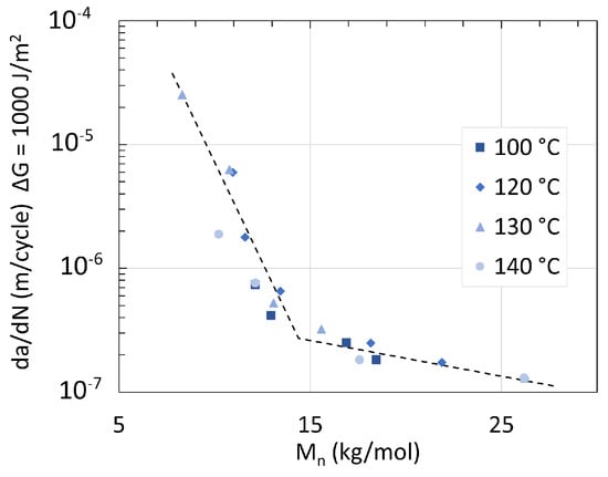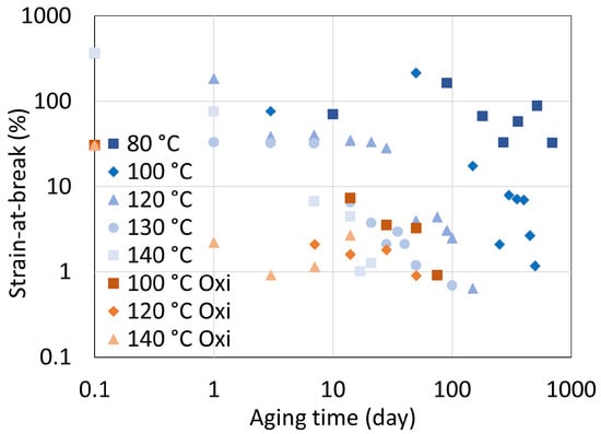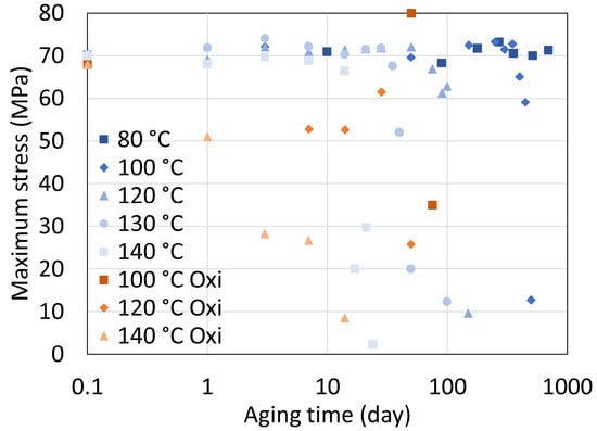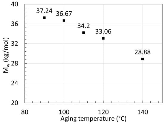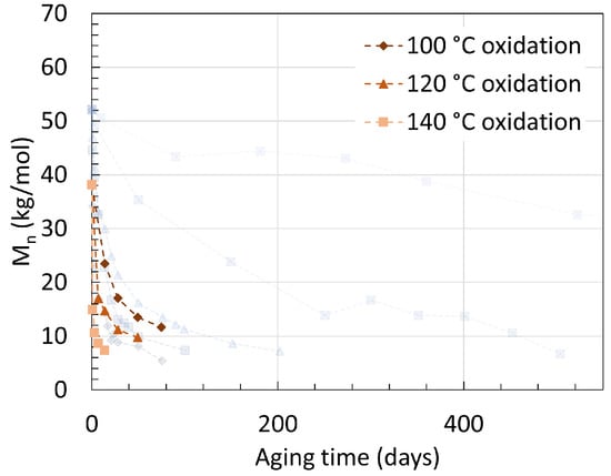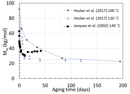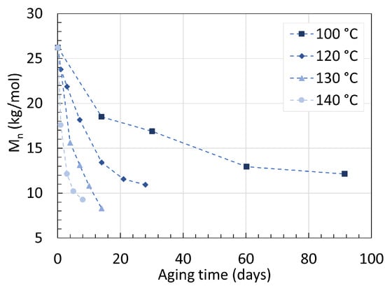 Another earlier work from Deshoulles et al. [55] aimed at determining a parameter able to track the embrittlement or, i.e., the ductile to brittle transition of PA6. Neat PA6 without additives was aged in deoxygenated water and dry hot air separated once again for up to almost 2 years with temperatures ranging from 80 C to 140 C. The samples had a thickness of 250 m and 75 m, respectively. The PDI recorded from aging through both pure hydrolysis and pure thermal oxidation remained equal to 2.5 ± 0.5. This high deviation created a large uncertainty, preventing a direct comparison to other PDI values from other sources. The changes in M are shown in Figure 5 for both pure hydrolysis and Figure 6 for pure thermal oxidation.