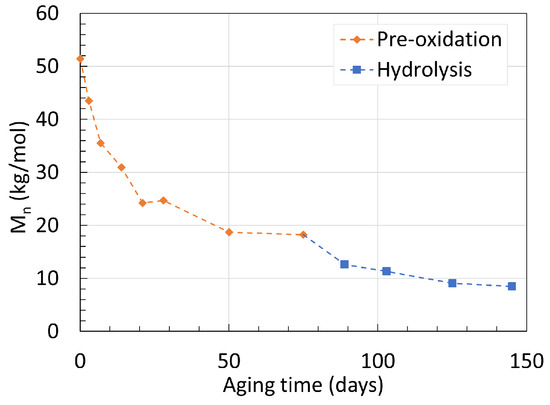 To investigate the coupling effect of hydrolysis and oxidation, Deshoulles et al. [48] aged their 0.25 mm thick neat PA6 material in dry hot air, deoxygenated water, and oxygenated water at 80 C for long periods of time. Their GPC data are presented in Figure 2. The starting M was 52.3 kg/mol for all three degradation mechanisms. In deoxygenated water, M reached 32.5 kg/mol after 700 days of aging. In dry hot air, M reached 13.8 kg/mol after 630 days, making thermal oxidation a faster degradation process than pure hydrolysis at 80 C. And finally, when immersed in oxygenated hot water, M fell drastically down to 13.5 kg/mol after merely 28 days, 80 times faster than pure hydrolysis. This underlines the importance of carefully removing oxygen from the aging chamber both in the solution and above it. The PDIs recorded for all three mechanisms are all dissimilar to one another. Similar to the previous data from Arhant et al. [52] as well as an earlier work from Deshoulles et al. [56], the PDI for pure hydrolysis at 80 C remained at 2.3 constantly. For thermal oxidation, the PDI rose from 2.3 to 2.9 after the 630 days of aging. The authors issued this phenomenon to the cross-linking taking place at the last stage of oxidation. The PDI rose to even higher values when both mechanisms were combined. A PDI of nearly 4.5 after the 28 days of aging was reported, indicating that the chain scission process occurs in a less random manner compared to pure hydrolysis.