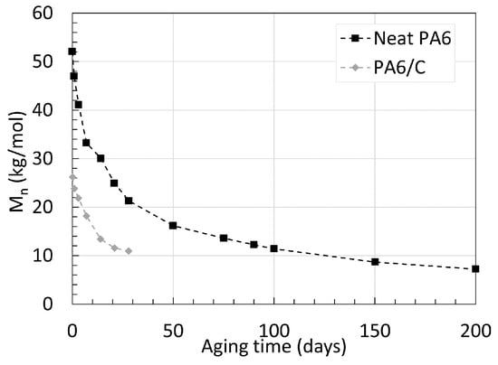 When comparing the decrease in M of PA6/C and neat PA6, one can notice the significantly slower drop in M of the neat PA6 over time. At 80 C, the neat PA6 obtained a M 32.4 kg/mol after 700 days of aging, compared to the PA6/C that reached a M of 12.1 kg/mol after only 90 days of aging at 100 C; both reached equilibrium. The fibers were described by Arhant et al. [52] as being indifferent to both the effect of water and temperatures as high as 120 C. Hence, the contrast may originate solely from the small difference in aging temperature, pointing out that an exponentially higher degradation rate occurs with aging temperatures higher than 80 C for PA6. This indication is further supported by looking at an earlier work from Deshoulles et al. [56], where, again, neat PA6 with a thickness of 0.25 mm was aged in deoxygenated water, but at 120 C until equilibrium. Both trends are shown in Figure 4. The M of both PA6s decreases to a similar value. Notably, a higher starting M also seems to result in a faster degradation rate. In the case of glass fibers, the presence of reinforcement has been associated to a lower water absorption property due to the simple fact that less PA is present in the network when reinforced [26]. If the two PA6 were to start at similar M, it is likely that the reinforced PA would degrade slower.