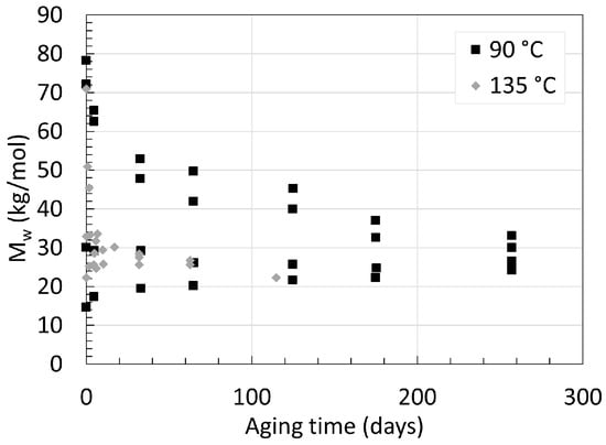 In addition to PA6, knowing the degradation behavior of PA11 in deoxygenated water has also been of great interest. This comes from one of its main applications as internal pressure sheath in offshore underwater flexible pipes where the concentration of oxygen is scarce [51]. PA11 harbors a high chemical resistance, with a working temperature ranging from −40 to 130 C. [71]. PA11 also undergoes hydrolysis like PA6 or PA66. The main difference lies behind PA11’s water affinity worsened by its longer carbon chain. Meyer et al. [68] aged an unplasticized, laboratory-made 3 mm thick neat PA11 in deoxygenated water at temperatures ranging from 90 C to 135 C with varying starting average molecular weight (M). The M is another way of describing the molecular weight of polymers and is always greater than M. Factoring the M with the PDI provides M. The variations of M over time at 90 C and 135 C are displayed in Figure 7.
