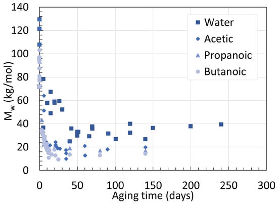 The effect of pH has been briefly mentioned before, but not extensively. When one thinks of reducing the pH of an aging chamber, hydrochloric acid [68,72] or sulfuric acid [73] are often used. An earlier work from Hocker et al. [61] investigated the possibility of using organic acids instead. The authors found that not only do organic acids degrade PAs faster than inorganic acids, but the weaker the organic acid, the faster the degradation. This was attempted with acetic, propanoic, and butanoic acid at a concentration of 1.05 × 10 M for all three on their 250 mm to 1 cm laboratory-made thick PA11 sample. For PA11 aged in water, M at equilibrium reached 24.4 kg/mol and 26.9 kg/mol for 100 C and 120 C respectively. The higher M is likely an exception occurring from the small temperature difference. The rate of hydrolysis, on the contrary, increased from 0.43 to 1.64 from the temperature increase, proving again that the main effect of temperature is acceleration. Another experiment from Hocker et al. [58] was designed to determine the ductile to brittle transition. In this attempt, they also aged two PA11 samples with a thickness of 2 ± 0.5 mm and 0.3 ± 0.02 mm in water, acetic acid, and butanoic acid at 120 C. As the data originate from the same research group and consist of the same experimental setup, the results are combined and depicted in Figure 10. At 120 C, the M of neat PA11 at equilibrium reached 26.9, 20.0, 17.0, and 14.5 kg/mol when aged in water, acetic, propanoic, and butanoic acid solutions. Acids have two effects on degradation, a hydrolysis acceleration effect as well as an amine scavenging effect. The solubility of the acid in regard to the PA is the governing factor, not its pH.