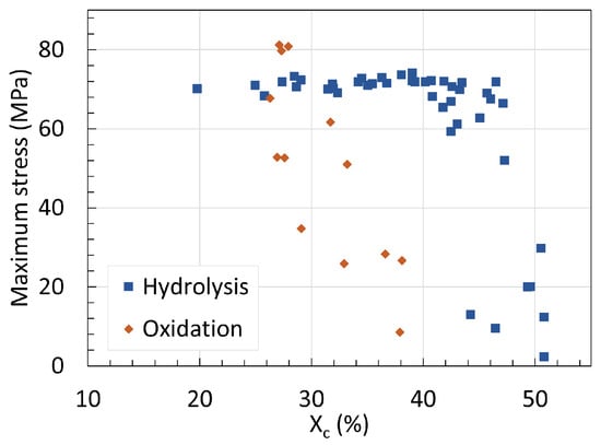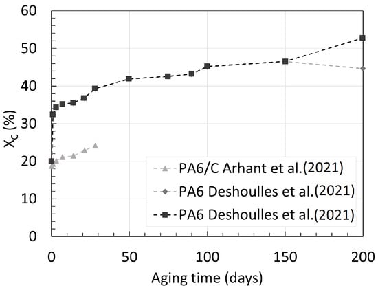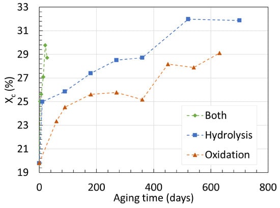 The variations of X of 0.25 mm thick neat PA6 at 80 C from Deshoulles et al. [48] when aged under thermal oxidation, pure hydrolysis, and hydrothermal oxidation are shown in Figure 14. The X value rises from 20 to 29% after 620 days of thermal oxidation, 32% after 700 days of pure hydrolysis, and 30% after only 21 days of hydrothermal oxidation. The increase in X is exponential within the first day, and to some extent the first few minutes of aging except for thermal oxidation where the increase is slightly more linear. This is attributed to the formation of a monoclinic crystalline -phase in hot water, a process separate from chemi-crystallization. Crystallinity in semi-crystalline polymers like PAs is originating from the hydrogen bonds of their amide groups. As the number of hydrogen bonds increases, so does X. Water rearranges these bonds by also creating additional hydrogen bonds within an amorphous matrix [26,75]. This results in a faster and stronger increase in X despite a slower rate of degradation, as shown when comparing the data to thermal oxidation.