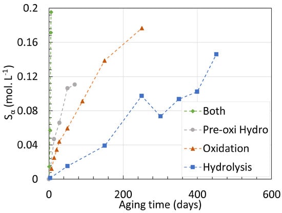 Deshoulles et al. [48] also calculated S for pure hydrolysis after 75 days of pre-oxidation. For that mechanism, S is higher than pure hydrolysis and thermal oxidation but still lower than hydrothermal oxidation. The reason remains the same; oxidation products like imides enhance hydrolysis by presenting more lone pairs from the carbonyl group to be attacked by water molecules.