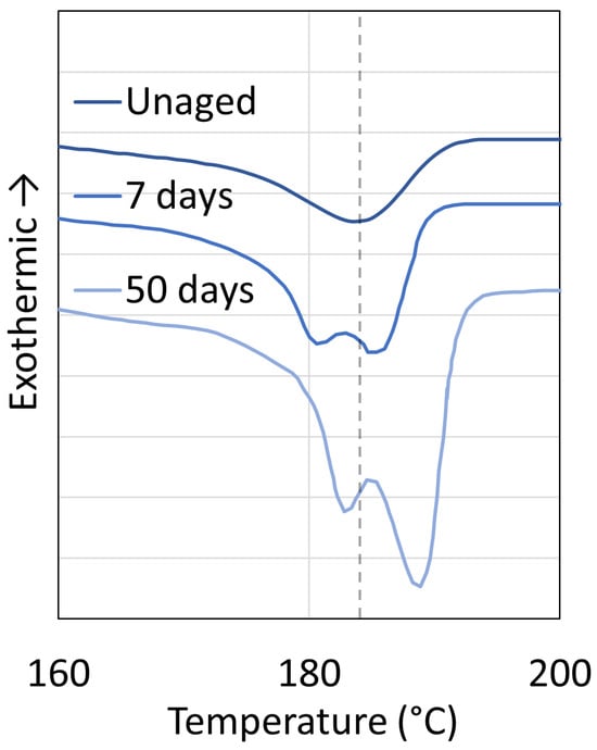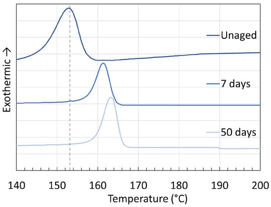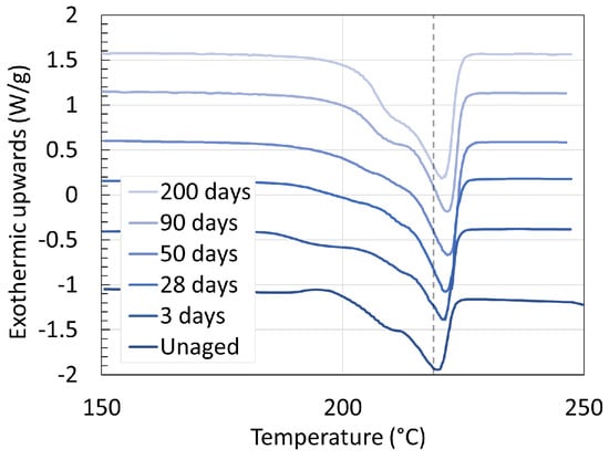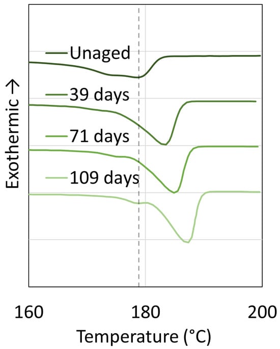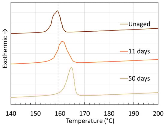 The cooling scans of aged PAs also draw interesting information. The scans from Domingos et al. [62] and Romão et al. [1] are shown in Figure 23 and Figure 24, respectively. The displayed peaks represent the crystallization temperature (T) of PA11. T values are different for both unaged PA11; however, after 50 days of aging, they both shift to a similar higher value, all while presenting a narrower signal. This is said to be yet again originating from the formation of lower molar mass oligomers from the amorphous phase migrating to the crystalline phase [1,62,88,89].