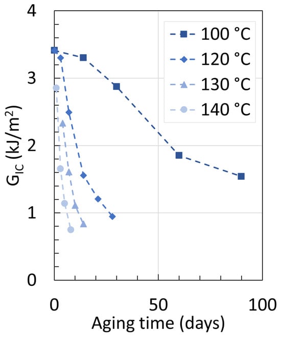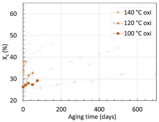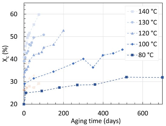 Rising the aging temperature causes the X to rise faster and to higher values, as seen with the data from Arhant et al. [52]. Similar setup for neat PA6 from Deshoulles et al. [55] was performed in both deoxygenated water and dry air. The corresponding data are presented in Figure 18 and Figure 19, respectively. Despite a slower degradation of PA6 under pure hydrolysis, the measured X reached higher and faster values than that of degradation under thermal oxidation. At 80 C, X appears to converge towards about 33% after 600 days of aging. However, at 140 C, X rises to values higher than 60% after about 100 days of aging, and this value does not appear to reach an equilibrium. This is extremely interesting as this behavior is relatively dissimilar to the changes in molecular weight, where all trends converge towards a similar value regardless of the aging temperature.