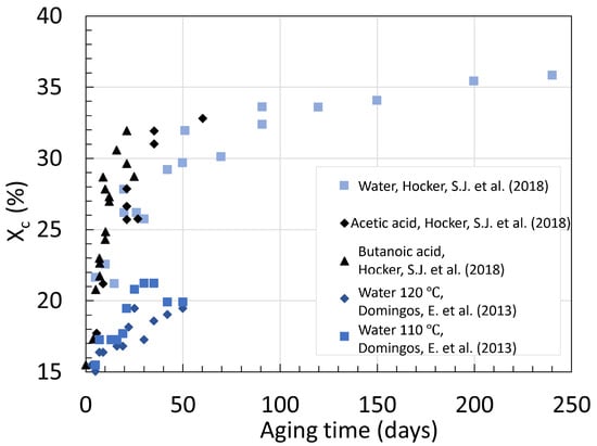 Using the authors’ H data, X can be extracted for the aging experiment of PA11, as the authors do not display it themselves. However, H for the standard 100% crystalline PA11 remains disputed. Da Costa et al. [51], Maïza et al. [57], da Cruz et al. [50], and Olufsen et al. [54] used a H of around 226 J/g [78], which is in agreement with other sources [79,80,81], while Hocker et al. [58,59] used 189 J/g [82] in their articles. Some other literature work [83,84,85,86,87], irrelevant to the topic of pure hydrolysis of PAs, used a H of 206 J/g as reference. Based solely on the amount of sources, the most accurate value is likely between 206 J/g and 226 J/g. Using a different standard for assessing X does not hinder the end result of one set of data. However, we have to remain careful and aware of that when cross-analyzing different X data.
