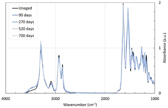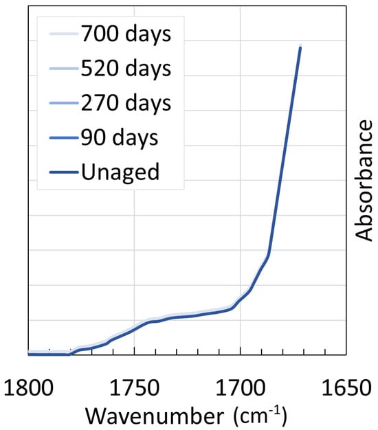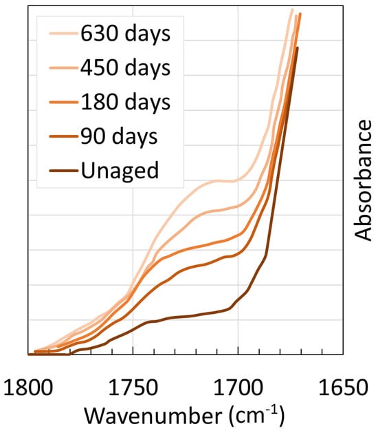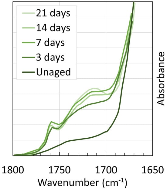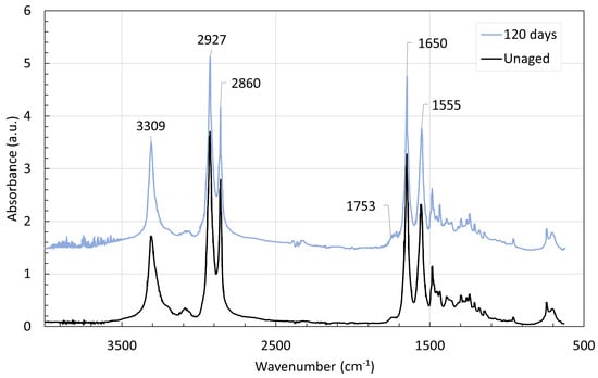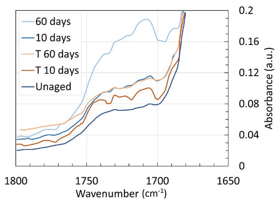 To decouple both mechanisms further, a sample of neat PA6 was aged in dry hot air until molecular weight equilibrium, then placed in deoxygenated hot water. We note that the equilibrium reached when aged under oxidation and hydrolysis is different, as oxidation includes radical chemistry which leads not only to the formation of amines and carboxylic acids, but also cross-linking, bridging, and more. The results are shown in Figure 3. Both mechanisms were taking place at 100 C to accelerate the procedure. The M decreased further even after the pre-oxidative treatment. This phenomenon is linked to the formation of imides during oxidation before chain scission, enhancing the likelihood of hydrolysis occurring from these chemical groups. This has been proven through Fourier-transform infrared (FTIR) spectroscopy. The infrared spectra are discussed further in Section 4.