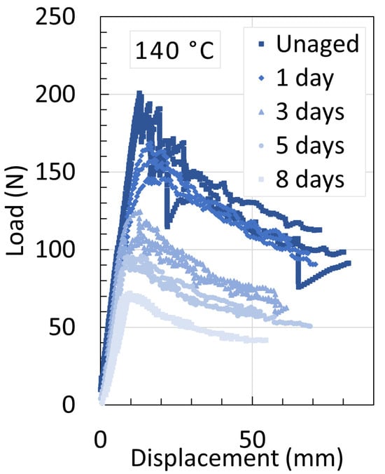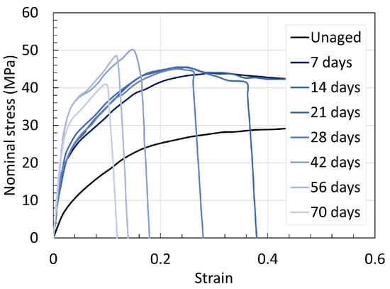The M of PA11 dropped faster and reached lower values when aged in acetic acid than hydrochloric acid, despite their similar pH. Plasticized PA11 resists well against the effect of degradation due to BBSA disrupting the hydrogen bonding matrix in PA11. The correlation between M or M and mechanical properties is investigated in Section 5.