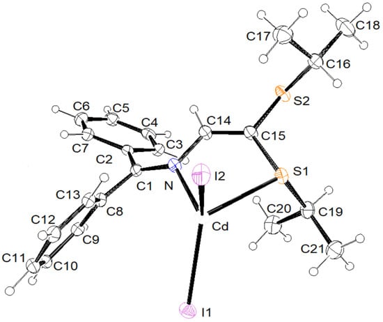 The molecular architectures of mononuclear complexes 1 and 2 are depicted in Figure 1 and Figure 2, respectively. They show the presence of two iodides and of S and N coordination sites from the azabutadiene ligand. The metal centers are thus four-coordinated with coordination polyhedra severely distorted from regular tetrahedral geometries. The Cambridge Crystallographic Database (version CSD 5.43, November 2021) contains three entries for four-coordinate HgI2 adducts with N and S coordinating atoms [41,42]. On the other hand, there is no example of a purely four-coordinate CdI2 N,S adduct. Instead, two entries for pentacoordinate complexes are present [43,44]. The CdI2 compound 1 described here thus represents the first four-coordinate complex of CdI2 bearing a N,S donor set.