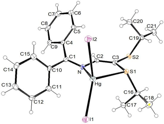 [HgI2{(iPrS)2C=C(H)-N=CPh2}] 2: Yellow crystal. Yield: 44%; IR-ATR: 1595 (C=C), 1489 (C=N) cm−1; UV–vis (CH2Cl2) [λmax nm (ε)]: 252 (59,500 M−1 cm−1), 378 (38,800 M−1 cm−1); C21H25HgI2NS2 (809.96): Anal. calcd. C 31.14, H 3.11, N 1.73, S 7.92; found: C 31.06, H 3.05, N 1.69, S 7.88.