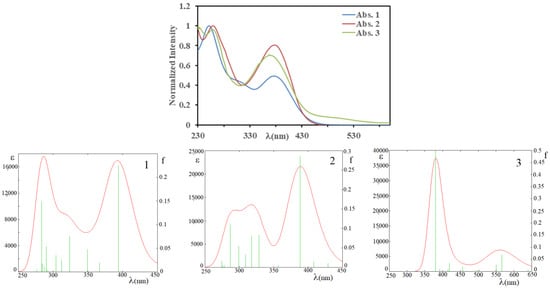 Experimental (top) and calculated UV–vis spectra (bottom) of 1 (blue), 2 (red) and 3 (green); ε, molar absorptivity; λ, wavelength; f, oscillator strength.