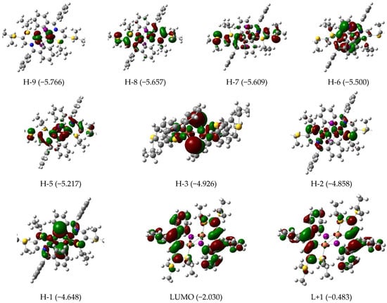 The target molecular orbital (MO) in all calculated transitions for 1 and 2 is the LUMO one. The low-energy band in both spectra (close to 390 nm) is generated by HOMO-4 with the contribution of HOMO-3 in 2. The shoulder in complex 1 is composed of four weak transitions from HOMO-7 to HOMO-11 and the corresponding band in 2 contains the transitions from H-6 to H-9, which have similar shapes. The high-energy band calculated near 280 nm originates from the mixing of H-11 and H-10 for 1 and from H-10 for 2. The molecular orbitals involved in these transitions are depicted in Figure 5 and Figure 6. The LUMO corresponds principally to the LUMO π molecular orbital of 2-azabutadiene molecule delocalized over lateral C atoms and the central C-N bond (Figure 7) [7], whereas the HOMO-4 exhibits alternating π lobes from one phenyl ring through the azabutadiene array to sulfur atoms. The azabutadiene molecule introduces into this H-4 MO its HOMO π MO covering the C=N and C=C bonds. It is worth noting that the four highest occupied MOs (HOMO to HOMO-3) in both complexes 1 and 2 are formed in more than 90% by contributions of the p atomic orbitals of iodine atoms.