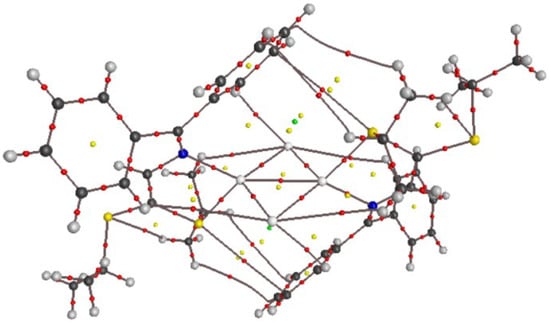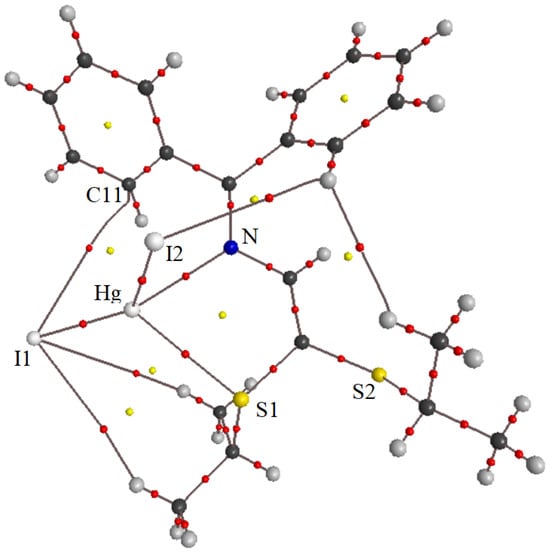 It is interesting now to compare the topological parameters calculated for dinuclear complex 3, in which the iodine atoms are bridging, with those of the mononuclear complexes 1 and 2, in which the iodides are terminal. It is generally accepted in crystal chemistry that the bridging bonds are weaker than the terminal ones, but the Cu–S and Cu–N bonds and above all the influence of the relative hardness of Cu(I) with respect to Cd(II) and Hg(II) on the AIM parameters reported in Table 4 warrant discussion. Parr and Pearson reported the following values of hardness for the cations employed in this study: 10.3 eV (Cd2+), 7.7 eV (Hg2+) and 6.3 eV (Cu+) [72,73]. Following their classification, Cu+ is slightly softer than Hg2+ and Cd2+ is the hardest one among these three soft cations. The molecular graph of complex 3 is presented in Figure 10.