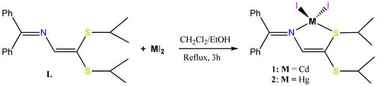 The synthesis of cadmium and mercury complexes of the types [MI2{(iPrS)2C=C(H)-N=CPh2}] (1) and (2) was carried out via reacting solutions of the CdI2 or HgI2 salts in ethanol in the presence of ligand L under reflux (Scheme 1).