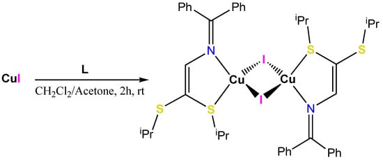 Synthesis of [{Cu(µ-I)}2{Ph2C=N-CH=C(S-iPr)2}] 3: A solution of CuI (190 mg, 1 mmol) in 5 mL of acetone was added to a solution of the ligand L (711 mg, 2 mmol) in 5 mL of dichloromethane. The mixture was stirred at room temperature for 2 h and the layering with diethyl ether afforded red-coloured crystals, suitable for X-ray diffraction. Red crystal. Yield: 75%. Anal. calcd. for C42H50Cu2I2N2S4 C, 46.19; H, 4.62; N, 2.57; S, 11.75. Found: C, 46.08; H, 4.57; N, 2.49; S, 11.64. IR-ATR: ν(C=C) 1596, ν(C=N) 1514 cm−1; 1H NMR: δ/ppm 1.17 (d, 3J = 6.7 Hz, 12H, 4CH3), 1.34 (d, 3J = 6.7 Hz, 12H, 4CH3), 3.25 (sept, 3J = 6.7 Hz, 2H, SCH), 3.73 (sept, 3J = 6.7 Hz, 2H, SCH), 7.14–7.42 (m, 16Har + 2HC=C), 7.69 (d, 3J = 7.5 Hz, 4Har); 13C{1H} NMR: δ/ppm 22.8 (s, CH3), 23.0 (s, CH3), 37.9 (s, SCH), 38.6 (s, SCH), 128.2-132.4 (9s, Car + C=CH), 136.6 (s, C=CH), 139.2 (s, C=N). UV–vis: 231 (62,000), 259 (60,300), 373 (43,800), 498 sh (4500).