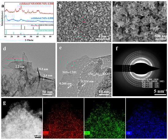 (a) XRD pattern of exfoliated NiFeOOH-NiFe-LDH and exfoliated NiFe-LDH. (b,c) SEM images, (d,e) TEM images, (f) SAED patterns and (g) TEM images with EDS-mapping images of NiFeOOH-NiFe-LDH.