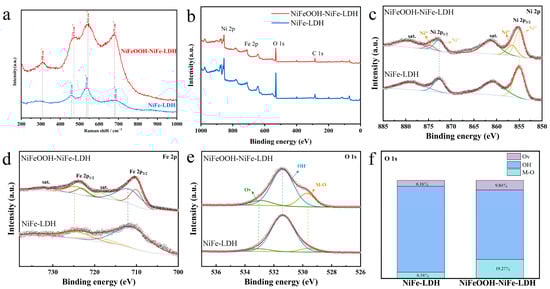 (a) Raman spectra, (b) XPS survey spectra and single-element spectra, (c) Ni 2p, (d) Fe 2p, (e) O 1s and (f) percentage of O element in different forms of NiFeOOH-NiFe-LDH and NiFe-LDH.