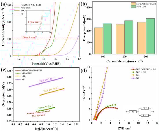 By means of a three-electrode setup, we investigated the electrochemical OER performance of various electrodes in 1 mol·L−1 KOH solution. Commercial IrO2/Ti and NF were also tested for comparison. In Figure 4a, the onset potential of NiFeOOH-NiFe-LDH at 1 mA·cm−2 was 1.337 V. NiFeOOH-NiFe-LDH has an overpotential of only 227 mV at 100 mA·cm−2, which was not only the lowest overpotential among the electrodes (Figure 4b) but also better than recently reported catalysts (Table 1).