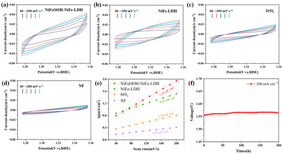 The Cdl measurement at the non-Faraday region potential window: (a) NiFeOOH-NiFe-LDH, (b) NiFe-LDH, (c) IrO2 and (d) NF. (e) The value of Cdl of different catalysts. (f) Chronoamperometric plots at 100 mA·cm−2 for NiFeOOH-NiFe-LDH.