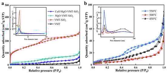N2 isothermal sorption curves and the textural properties of the samples are shown in Figure 1 and Table 1. According to Figure 1a, it can be seen that all four samples exhibited IV-type isotherm adsorption curves and H4 adsorption hysteresis loops. The isotherms of the VMT sample are very close to the horizontal axis in the low-pressure region, and capillary condensation steps occur at a relatively high P/P0 pressure range, characteristic of unconstrained single-layer or multi-layer adsorption in narrow pore channel structures [8]. The adsorption curve of the VMT-SiO2 sample deviates from the longitudinal axis at near-zero relative pressure, indicating that nitrogen has a strong interaction force in the microporous structures of the material. The obvious adsorption hysteresis loop occurred at around P/P0 = 0.5, indicating the existence of abundant mesoporous structures due to the fact that most metal oxides impurities in vermiculite structure are dissolved by mixed acid and the remaining tetrahedral silica species form a mesoporous skeleton structure. When only MgO was loaded onto the VMT-SiO2 support, the adsorption isotherm curve of MgO-VMT-SiO2 became relatively gentle. When further loading CuO, the adsorption isotherm curve of CuO/MgO-VMT-SiO2 became smoother, with only a slope higher than that of VMT, indicating that active components entered into the mesoporous channels of VMT-SiO2, causing the plugging hole phenomenon to occur. The pore size distribution curves show that the pore sizes of the VMT-SiO2-based samples gradually converged to less than 10 nm due to the final aggregation in mesopores with the loading of MgO and CuO active components. From Figure 1b, it is clear that CuO/MgO-VMT-SiO2 catalysts with different calcination temperatures show IV-type isothermal adsorption lines and H4 adsorption hysteresis loops at around P/P0 = 0.5, which are characteristic of typical mesoporous materials. As the calcination temperature rises, the slope of the IV-type isothermal adsorption lines becomes more gentle with the smaller H4 adsorption hysteresis loops, which is probably due to the fact that the interaction between MgO, CuO and the carrier is enhanced and causes the partial destruction of some mesoporous structures. From the pore size distribution curve presented in Figure 1, it can be observed that the most accessible pore sizes of the samples are mainly concentrated in 2–4 nm, and the calcination temperature had no significant influence on the pore size distribution.