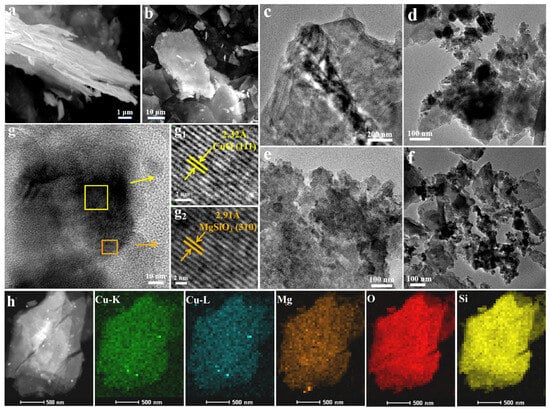 SEM images of (a) raw VMT and (b) VMT-SiO2; TEM images of (c) MgO-VMT-SiO2 and (d–f) CuO/MgO-VMT-SiO2 (450 °C, 500 °C, 550 °C); HRTEM images of (g(g1,g2)) CuO/MgO-VMT-SiO2 (500 °C); (h) EDX-mapping of CuO/MgO-VMT-SiO2 (500 °C) catalyst.