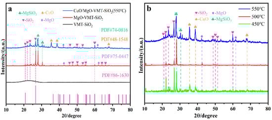 Powder X-ray diffraction (PXRD) patterns of (a) catalysts with different components and (b) CuO/MgO-VMT-SiO2 catalysts calcined at different temperatures.
