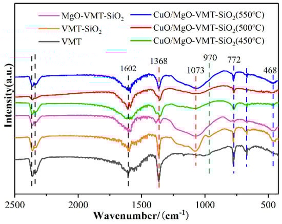 The FT-IR spectra of the samples are shown in Figure 4. The VMT-SiO2 sample exhibits an absorption peak at 970 cm−1, corresponding to the vibration of Si–OH bonds [9]. After loading MgO, this characteristic peak disappears. According to the literature, the surface hydroxyl groups of silica have a significant impact on the dispersion of the surface active components [9,10]. For MgO supported on silica materials, the weakening trend in the intensity of the Si-OH bond vibration bands indicated that the interaction between the loaded component and the carrier promotes the formation of Mg–O–Si bond structures. Therefore, for our present samples, the active hydroxyl groups on the surface of VMT-SiO2 mainly anchor magnesium oxide during the preparation process. The disappearance of Si–OH bond vibration bands on the prepared catalyst implies that the loading of magnesium oxide results in a more uniform surface on the carrier, with MgO forming additional Mg–O–Si bond structures with Si–OH bonds. PXRD and TEM analyses both confirmed this phenomenon. Simultaneously, for the samples with different components, the infrared absorption peaks are observed at 772 cm−1, 468 cm−1, and 1073 cm−1, which are consistent with the symmetric and antisymmetric stretching vibration of Si–O–Si bonds in the framework of VMT-SiO2 [11]. The infrared absorption peak at 1602 cm−1 can be assigned to water physically adsorbed on the surface of the sample [12,13]. The incorporation of magnesium oxide appears to diminish the intensity of the Si–O–Si bond peak, indicating that magnesium oxide was successfully integrated into the VMT-SiO2 framework and fostered robust interactions. Further adding copper oxide, the intensity of the Si–O–Si bond peak is largely weakened, suggesting that the inclusion of CuO serves to enhance the formation of magnesium–silicon oxidic composites. Finally, we investigated the impact of calcination temperatures on the catalyst structure. The catalysts calcined at three typical temperatures (450 °C, 500 °C, and 550 °C) display similar and obvious infrared absorption peaks at wavelengths of 1073 cm−1, 970 cm−1, 772 cm−1, and 468 cm−1. However, the peak intensity at 500 °C in these bands is notably weak, suggesting that a higher number of Si–O–Si bonds are being broken and stronger interactions are emerging between the active components over the samples. Furthermore, the characteristic absorption peaks across other wavenumbers exhibit similar patterns, demonstrating that the above three samples possess analogous structural characteristics.
