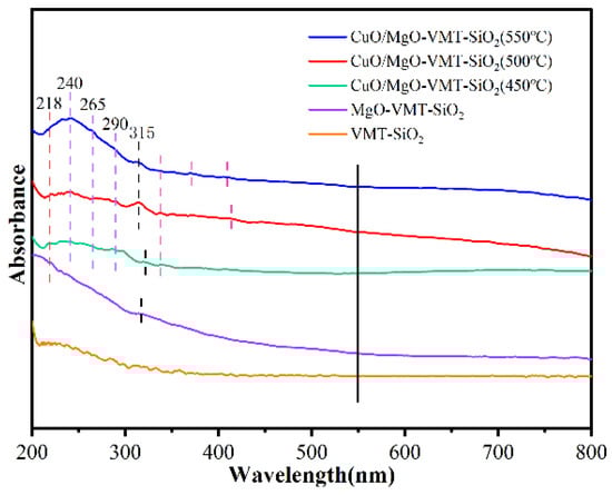 The UV-vis spectra were used to study the dispersion state and existing forms of MgO and CuO on the surface of VMT-SiO2 (see Figure 5). The peaks at 218 nm and 315 nm can be assigned to four-coordinated O2− ions in MgO crystals and water physically adsorbed on the sample surface [14,15]. The samples loaded with MgO exhibit a four-coordinated O2− ion absorption peak. For all the CuO-containing samples, multiple absorption peaks in the range of 200–550 nm appeared, coinciding with the additional transition ligand to the metal charge transfer band (LMCT). There are multiple peaks at 240 nm, 265 nm, and 290 nm, corresponding to the O2− to Cu2+ CT of the isolated copper oxide species, and the weak shoulder peak at 300–550 nm corresponds to the cluster-like species (Cu–O–Cu). These LMCT bands are structures related to the activity of the catalyst, and the cluster-like copper oxide species are more active and selective for the formation of 1,3-butadiene. Among them, the UV-vis spectra show similar absorption peaks at 300–550 nm, demonstrating the presence of cluster-like species (Cu–O–Cu), which are beneficial in terms of butadiene formation from ethanol [2]. Furthermore, the positioning of these CT bands is influenced by the type and morphology of the carrier as well as the method used for copper oxide loading [16,17,18]. For instance, Kong et al. noted changes in the intensity and position of CT bands in separated copper oxide from CuO/SBA-15 and CuO/KIT-6 [19]. Derrien and colleagues reported spectral bands of copper oxide on mesoporous silica spheres at 235 nm, while Shimokawabe et al. identified an additional dependence of morphology on the same band at 270 nm for copper oxide on silica [20,21].