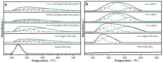The Synthesis of 1,3-butadiene from ethanol requires the synergistic effect of various surface acid–base sites; therefore, it is necessary to detect the acidity and alkalinity of the catalyst. Figure 6 shows the NH3-TPD and CO2-TPD curves of the catalysts, respectively. The NH3-TPD curve (Figure 6a) can be generally separated into three types of desorption peaks in different temperature ranges: a weak acid site from 100 °C to 200 °C, a medium–strong acid site from 200 °C to 300 °C, and a strong acid site above 300 °C. It can be observed that VMT-SiO2 only contains weak acid sites. Upon loading MgO, the MgO-VMT-SiO2 catalyst comprises weak, medium, and strong acid sites. The concentration of strong acid sites is the highest, followed by medium–strong and weak acid sites. When further loading CuO, the NH3-TPD curves for the CuO/MgO-VMT-SiO2 samples calcined at different calcination temperatures exhibit analogous peak shapes with respect to various acid sites, albeit with minor differences in peak areas. This suggests that altering the calcination temperature has a minimal impact on the acidity of the catalyst.