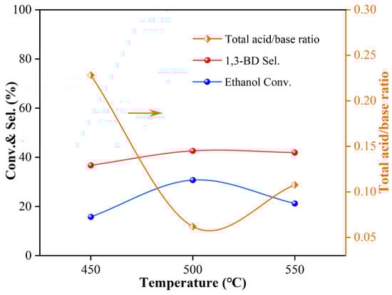 To clarify the results presented above, we outlined the relationship curve between the catalytic performances and total acid–base content of the samples, as shown in Figure 7. It can be observed that with increasing calcination temperatures in relation to CuO/MgO-VMT-SiO2, the total acid/base ratio first decreases, reaching a minimum value at 500 °C, and then increases, reversing the trend of ethanol conversion and the selectivity of 1,3-butadiene. Namely, the larger the total acid/base ratio, the more difficult it is to generate the target products. At 500 °C, the total acid/base ratio of the CuO/MgO-VMT-SiO2 catalyst is the smallest, which corresponds to higher ethanol conversion and 1,3-butadiene selectivity. This result indicates that we can regulate the production of 1,3-butadiene by changing the acid/base ratio on the surface of the catalyst.