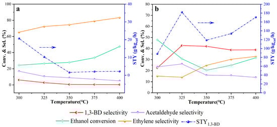 The changing curves of the catalytic performances as a function of temperature in relation to the catalysts: (a) VMT-SiO2 and (b) CuO/MgO-VMT-SiO2 (500 °C). Conv.: conversion; Sel.: selectivity; and STY: space-time yield. Reaction conditions: T = 300~400 °C, WHSV = 2.37 h−1, time-on-stream = 4 h.