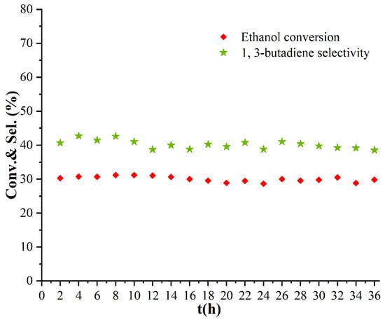 Catalysts with excellent performance should not only have high catalytic activity and target product selectivity but also have good stability. In this regard, we compared the catalytic performance discovered in this study with results obtained from related works reported in the literature (See Table 5). It can be seen from the table that WHSV is mostly around 1.0 h−1, and the maximum STY of 1,3-butadiene is 0.48 g·gcat−1·h−1, with the minimum being 0.13 g·gcat−1·h−1. In this paper, the STY of 1,3-butadiene is still in the middle range under the lower reaction temperature and the highest WHSV reaction conditions, which indicates that we can further optimize the experimental conditions, reduce WHSV, and continue to improve catalytic performance. At the same time, we also studied the change in ethanol conversion and 1,3-butadiene selectivity of the best-performing catalyst within 36 h (see Figure 9). It can be seen from the figure that within 36 h, ethanol conversion remained at about 30%, and the selectivity of 1,3-butadiene remained at about 40%, both of which had only slight fluctuations, indicating that the catalyst had good stability.