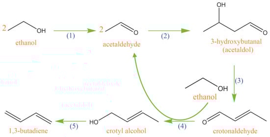 Main reaction pathway of the one-step ethanol conversion to 1,3-butadiene.