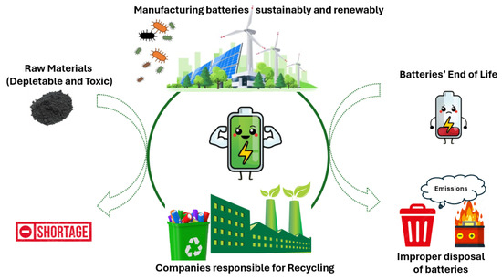 Illustration of the fabrication of batteries using raw materials, such as Pb, Li, and Co, and their tendency for shortage in the long term (left-hand side), followed by their end-of-life phase after usage and improper disposal, which poses hazards (right-hand side). In the center, the trend among recent and future companies is to recycle batteries and manufacture new ones in a sustainable manner, utilizing renewable resources, such as solar energy, wind power, bacteria, and enzymes.