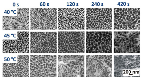 SEM images of the surface morphology of oxide layers anodized in phosphoric acid at 50 V in dependency on the dwell time and the bath temperature (reproduced with permission from the publisher under license number 5777000505982) [120].