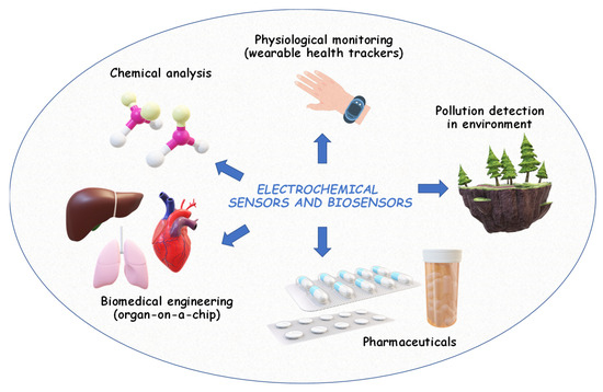 Electrochemical analysis (or electroanalysis) relies on the use of electrochemical methods to quantitively determine the concentration of an analyte in a sample. Typically, these methods include voltammetry [27], amperometry [28], potentiometry [29], and impedance spectroscopy [131] (the principle of these methods is detailed in § 2.2). These methods are employed to measure antioxidant activity [21,22] and analyze [24], and characterize various compounds and materials [25,26], as well as to develop reference methods [132]. Electrochemical sensors and biosensors are among the most common applications of electroanalysis. They are used for the detection of biomolecules [30,133], pollutants [31], and analytes in environmental samples [32,33], food [134], pharmaceuticals [34,35], and clinical and biochemical diagnostics [23,36,135]. These devices offer rapid, sensitive, and relatively selective measurements, making them valuable tools for research, quality control, and real-time process monitoring (Figure 5).