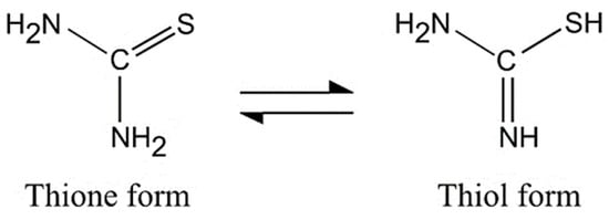 Thiourea is an organosulfur compound with a chemical formula of SC(NH2)2, and its structure is represented in Figure 1. Its structure is similar to that of urea (H2N-C(=O)-NH2), except the oxygen atom is replaced by a sulfur atom, indicated by the prefix “thio-” [1]. The term “thiourea” refers to a group of compounds with the formula (R1R2N) (R3R4N) C=S. Thiourea has two tautomeric forms: the thione form and the thiol form, as illustrated in Figure 2. The thione form is more prevalent in aqueous solutions, and the thiol form is also known as isothiourea.